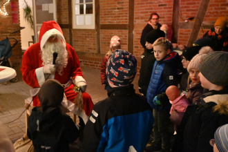 Am Spätnachmittag stimmten dann alle auf dem Hof gemeinsam einige Weihnachtslieder an - zum Glück, denn sonst hätte der Weihnachtsmann vielleicht nicht den Weg zum Dorfgemeinschaftshaus gefunden. Er beschenkte die Kinder mit kleinen, mit Süßigkeiten gefüllten Tütchen und wünschte allen Anwesenden frohe Weihnachten.