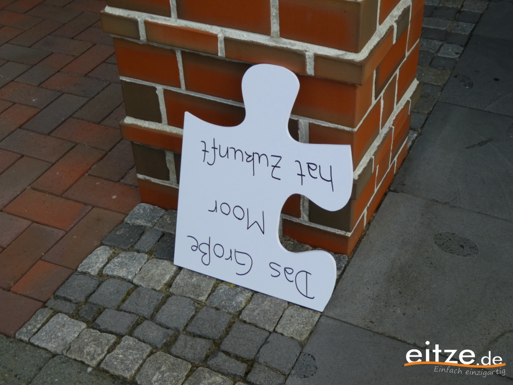 Zum Ende der Bereisung wurde es langsam eng mit der Zeit. Rund 80 Minuten waren schon vergangen als der Trecker samt Anhänger zur Eitzer Mühle einbog. Hier begrüßte Wiebke Stoltenberg die Kommission und stellte die Landfrauen und die Eitzer Vereine näher vor. Direkt an der Mühle durfte die Kommission dann auch den Wagen verlassen. Anschließend trug Lutz Wittboldt-Müller noch einiges zur Mühle vor. Zur gleichen Zeit wurde das Puzzle zusammgesetzt. Anja König fasste anschließend die letzten 90 Minuten zusammen und verwies auf das 1,20 x 2,00 Meter große Puzzle, welches nun das eigens für die Eitzer Ortschaft angepasste Logo des Wettbewerbs "Eitze hat Zukunft" zeigte.