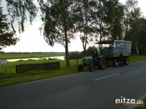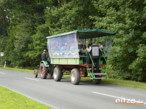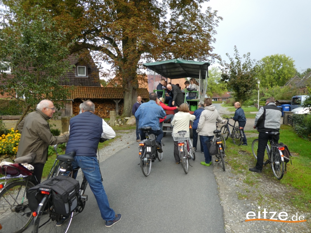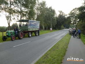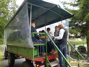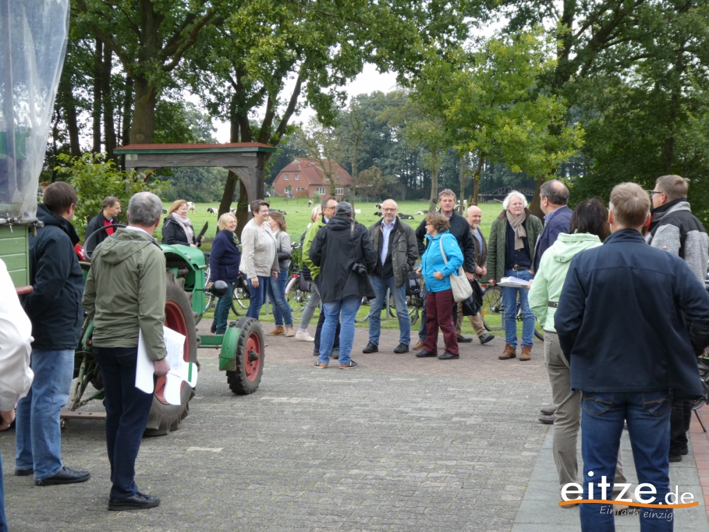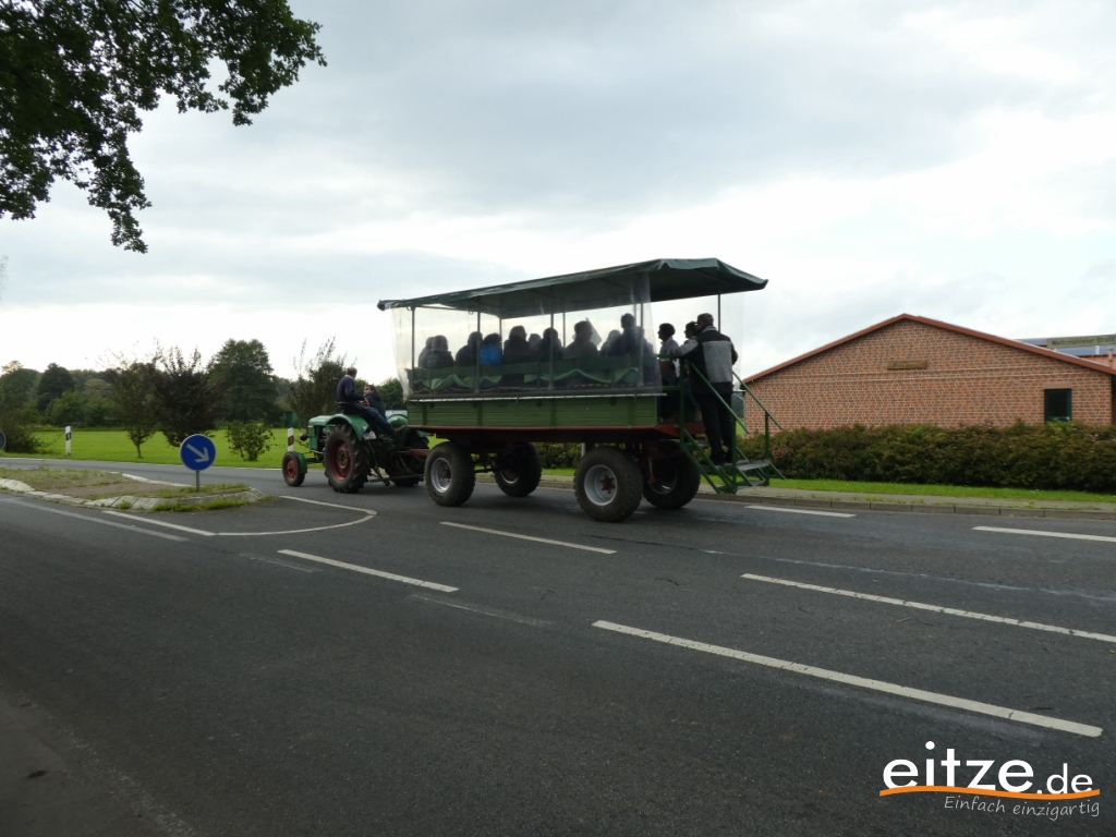 Mit einem Trecker und einem großen Wagen aus Luttum ging es dann zur nächsten Station. Vorbei am Spruchbalken des ehemaligen Eitzer Hofs entlang der Weitzmühlener Straße. Hier wurde über die Wiedervernässung des großen Moors berichtet. Nur wenige Meter weiter berichtete Sascha Thies über die Eitzer Neubürger und konnte ebenfalls ein Puzzleteil überreichen.