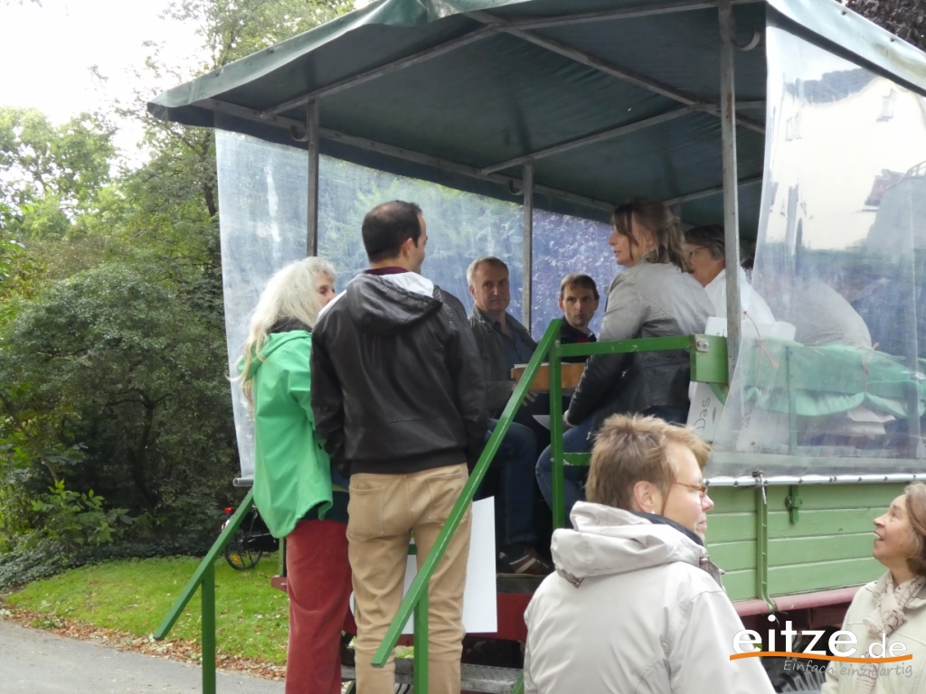 Der nächste Stop wurde an der Eitzer Friedhofskapelle eingelegt. Hier erzählten Ete Rademacher und Caren Klafke von der Eitzer Heimatbühne über den Bau der Eitzer Kapelle. Wussten Sie, dass die Heimatbühne extra für den Bau der Kapelle ins Leben gerufen wurde? Die Einnahmen der Theaterspieler wurde für den Bau der Kapelle gespendet.