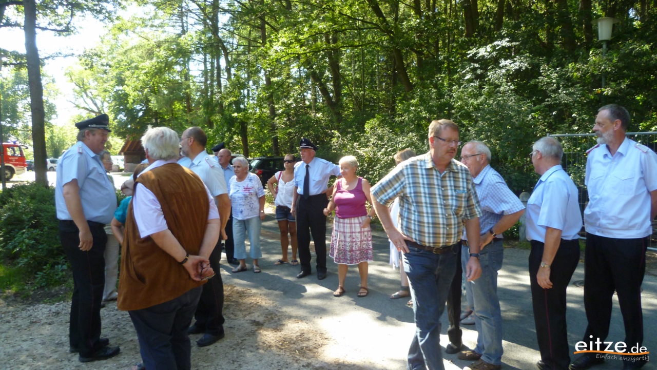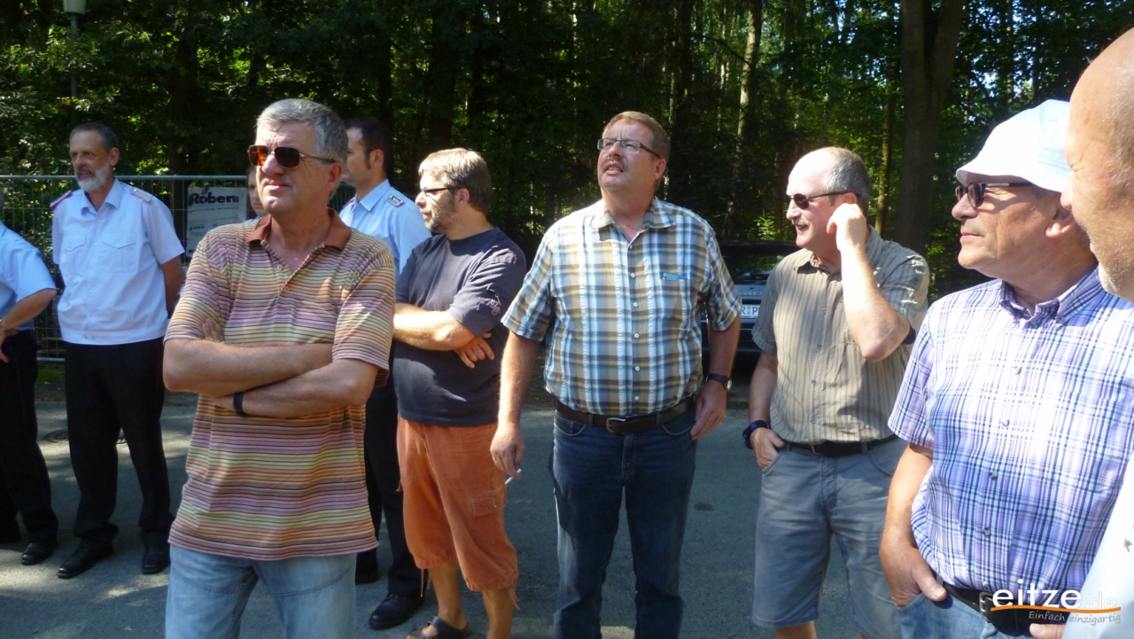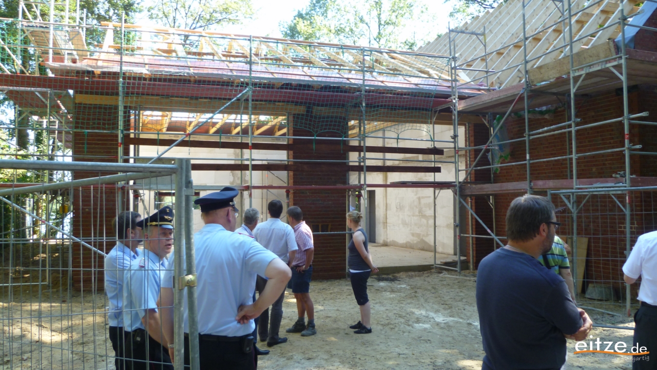 Stadtbrandmeister Wolfgang Schmidt betonte, die Eitzer Feuerwehr und ebenso der ganze Ort könnten stolz auf das zukünftige Feuerwehrhaus sein. Möge bald St. Florian als Schutzheiliger der Feuerwehren in das Haus einziehen, der „Rote Hahn“ aber die Feuerwehr möglichst wenig fordern. Bürgermeister Lutz Brockmann sprach von einem gelungenen Bau des Hauses, der an dieser Stelle entstanden sei.