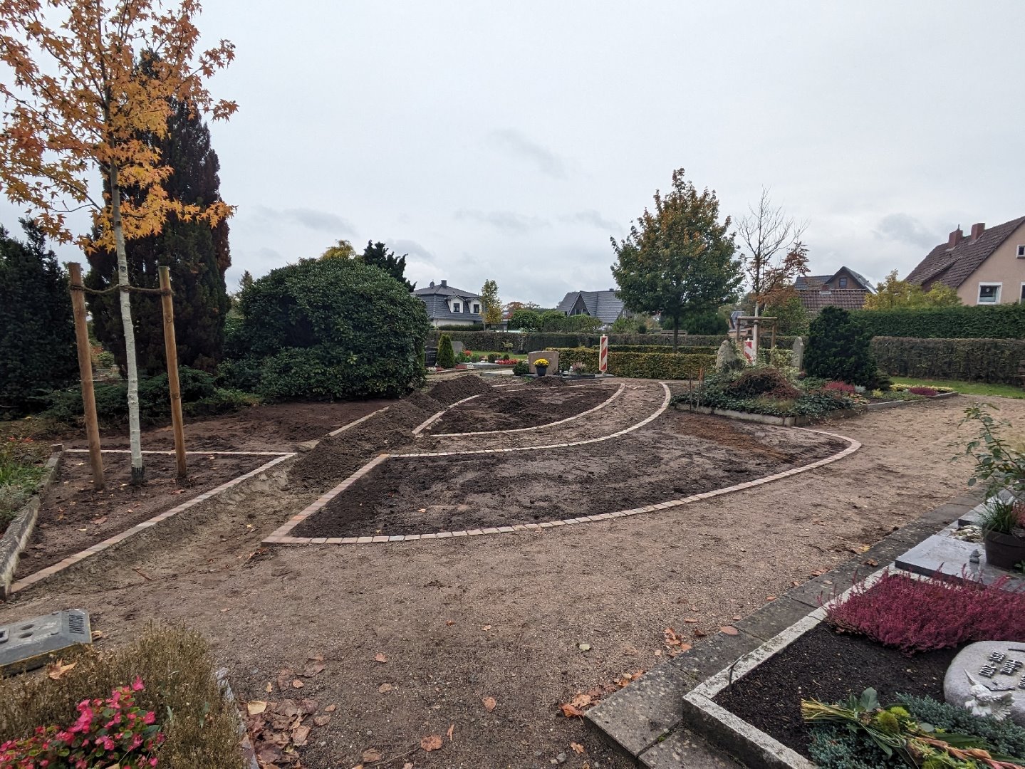 In der letzten Oktoberwoche haben die Bauarbeiten auf dem Friedhof für eine neue Urnengemeinschaftsanlage begonnen. Die beiden Bäume dafür waren ja schon im letzten Jahr gepflanzt worden.