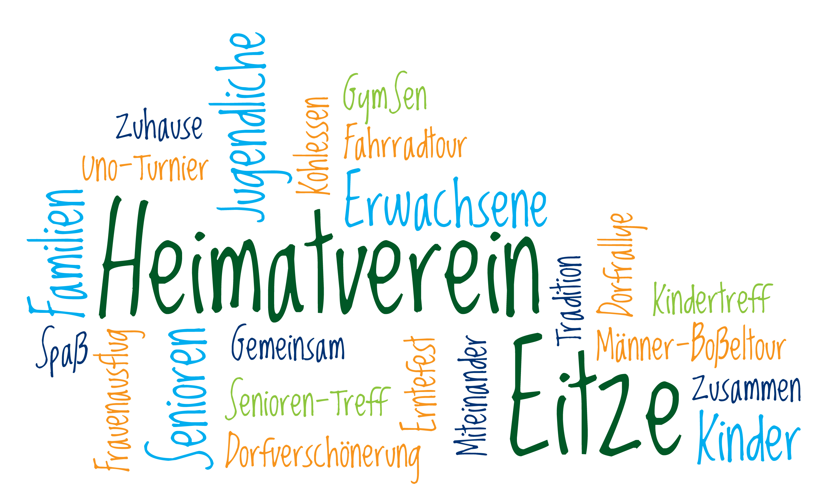 Daher hat sich der Vorstand auf die Frage konzentriert, wie kann das, was der Heimatverein Eitze ist, wofür er steht und was ihn ausmacht, sichtbar gemacht werden. Herausgekommen ist dabei eine Wortwolke mit dem Namen Heimatverein Eitze im Zentrum und darum herum Begriffe, die für die Vielfalt des Vereins stehen: die Menschen, die angesprochen werden sollen, die Veranstaltungen, die der Heimatverein durchführt, die Arbeitskreise, die das Vereinsleben ausmachen und wichtige Begriffe für das Selbstverständnis. Die Versammlung begrüßte diese Überlegungen, stand aber dem Plan des Vorstandes, dies als neues Logo für den Verein zu nehmen, uneinheitlich gegenüber. Daher wurde beschlossen, mit dieser Wortwolke als Grundlage weiter an einem neuen, zeitgemäßen Logo für den Heimatverein Eitze zu arbeiten.