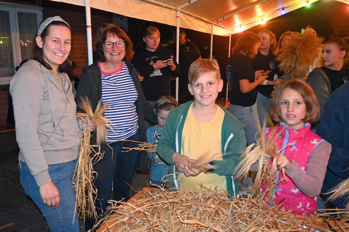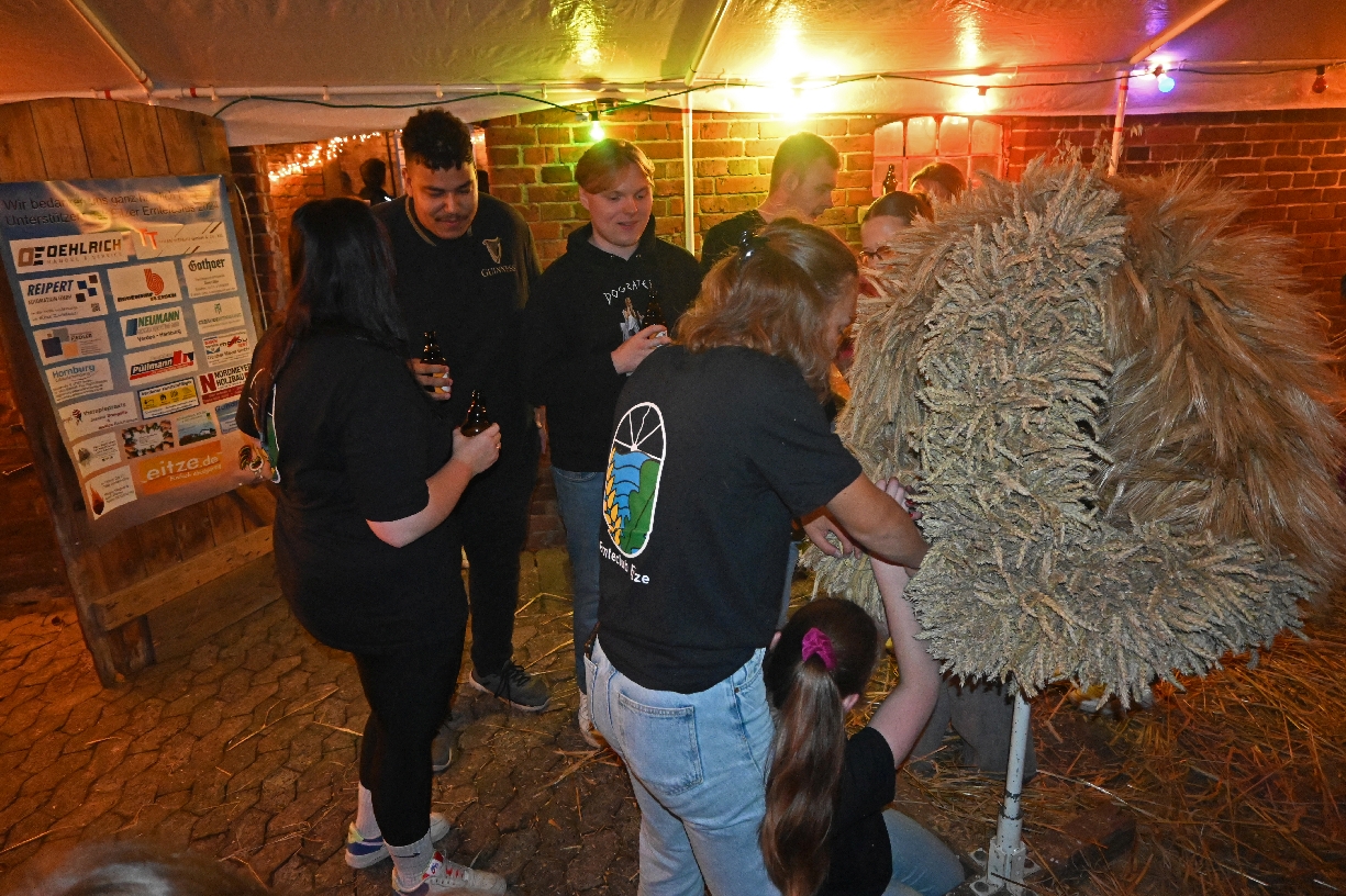 Am Donnerstag vor dem Erntefest trafen sich viele fleißige Helferinnen und Helfer auf dem Oestmann Hof bei der Eitzer Erntebraut Jessica Wolfgramm, um sie beim Binden ihrer Erntekrone zu unterstützen. Hafer, Gerste, Roggen und Weizen lagen bereit und in den nächsten Stunden entstand aus diesen Getreidesorten eine wunderschöne Krone. Der Brauch in Eitze ist ja, dass die Erntebraut ihre Krone selbst bindet – vor allem mit der Unterstützung der Braut aus dem letzten Jahr, Hannah Wittboldt-Müller und der des nächsten Jahres, Lotta Sucholinski. Die übrigen Helferinnen und Helfer hatten die Aufgabe, die Getreideähren zu kleinen Büscheln zusammenzusuchen und diese dann an die drei weiterzugeben, damit sie in die Krone eingebunden werden konnten. Mit der fertigen aber noch ungeschmückten Krone absolvierten Jessica und Favour dann schon einmal einen Ehrentanz vor dem applaudierenden Publikum.In diesem Jahr waren viele Jugendliche beim Kranzbinden dabei. Das ist ein Erfolg des Ernteclubs Eitze, den die Jugendlichen nach dem Erntefest des letzten Jahres gegründet hatten. Seine Mitglieder waren gut an den neuen T-Shirts zu erkennen, deren Anschaffung auch vom Heimatverein unterstützt worden ist. Das Wetter spielte – bis auf einen kurzen Schauer –mit, sodass bis spät in die Nacht auch draußen auf dem Hof gefeiert werden konnte. Die Erntepaareltern und der Heimatverein hatten gut für Essen und Trinken vorgesorgt, sodass sich alle in den kleinen Pausen während der Arbeit stärken konnten. Und diese wurden dann auch für viele Gespräche und manchen Spaß genutzt.