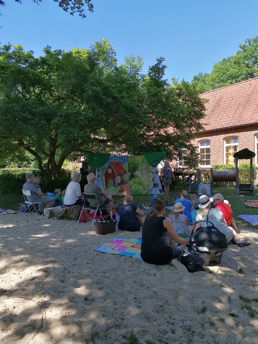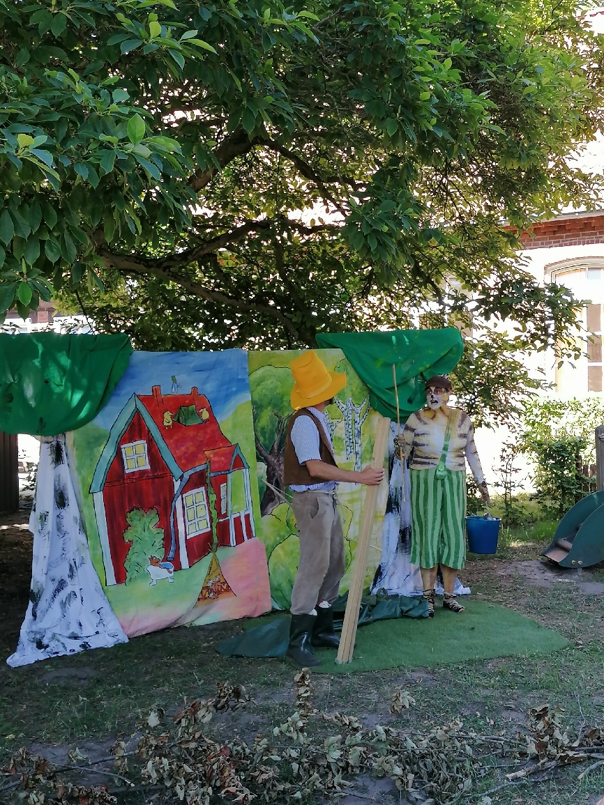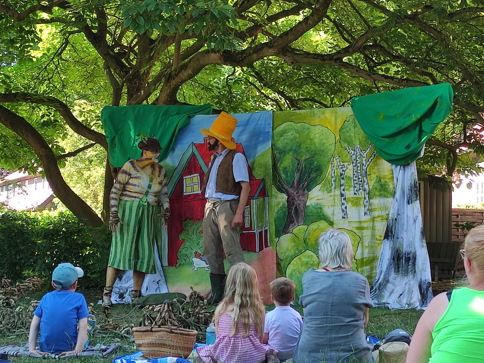 Bei bestem Wetter gastierten am Donnerstag, den 23.06.2022 Tanja und Felix Wegner vom Kindertheater SCHNURZePIEPE aus Bremen mit dem Stück „Petterson zeltet“ in Eitze auf dem Spielplatz am Dorfgemeinschaftshaus. Sie bauten unter dem großen schattigen Magnolienbaum ihre Bühne auf und mehr als 60 große und kleine Theaterfans machten es sich auf Picknickdecken oder mitgebrachten Stühlen drumherum bequem und genossen das Stück, das mit viel Liebe zum Detail gespielt wurde. Einige Kinder waren so begeistert, dass sie nach der Vormittagsvorstellung für das Kinderhaus am Nachmittag gleich ein zweites Mal zuschauten.