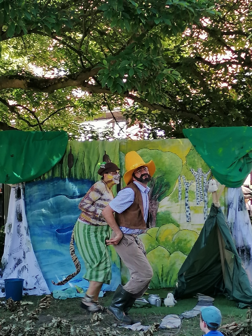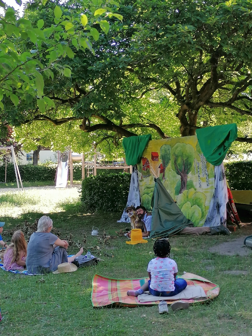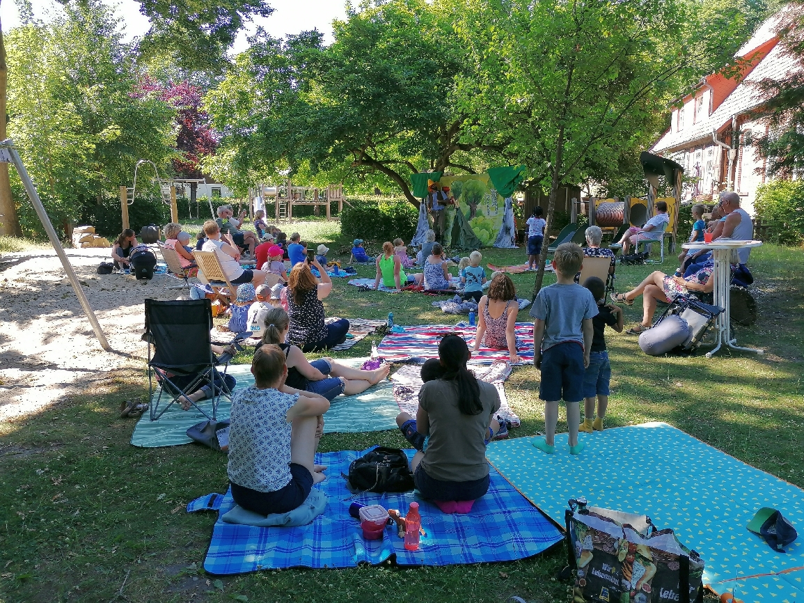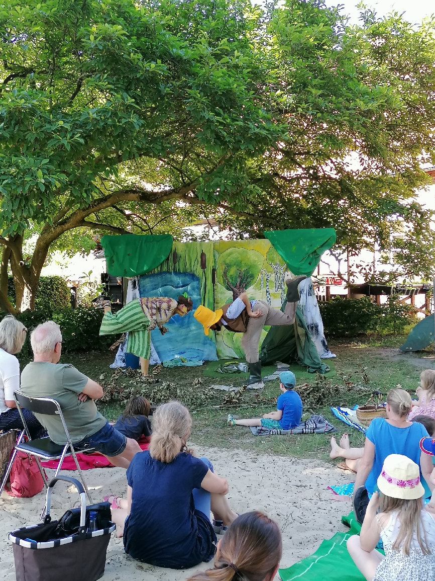Bei bestem Wetter gastierten am Donnerstag, den 23.06.2022 Tanja und Felix Wegner vom Kindertheater SCHNURZePIEPE aus Bremen mit dem Stück „Petterson zeltet“ in Eitze auf dem Spielplatz am Dorfgemeinschaftshaus. Sie bauten unter dem großen schattigen Magnolienbaum ihre Bühne auf und mehr als 60 große und kleine Theaterfans machten es sich auf Picknickdecken oder mitgebrachten Stühlen drumherum bequem und genossen das Stück, das mit viel Liebe zum Detail gespielt wurde. Einige Kinder waren so begeistert, dass sie nach der Vormittagsvorstellung für das Kinderhaus am Nachmittag gleich ein zweites Mal zuschauten.