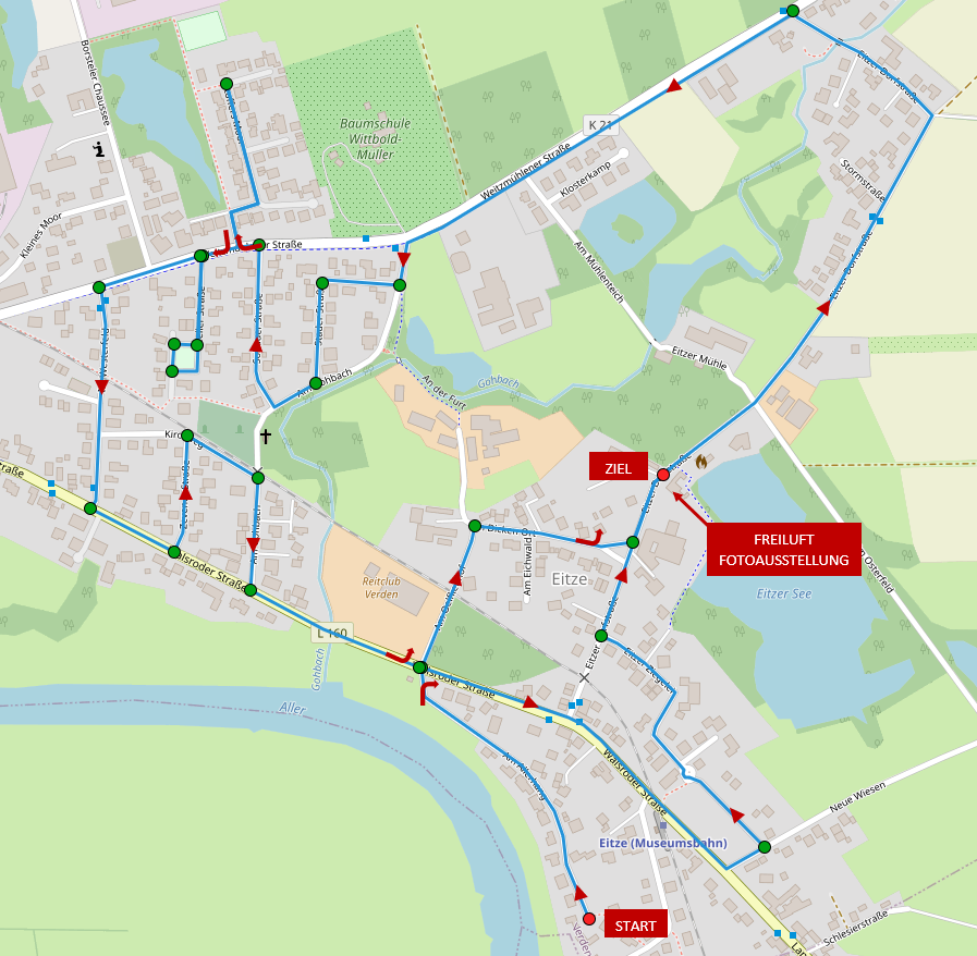 Start ist um 14.00 Uhr bei der Erntebraut 2021 Britt Wacker am Ende der Straße Am Allerhang. Dann geht es über die Walsroder Straße zur Bgm.-Krahn-Straße, durch die Eitzer Ziegelei, über die Eitzer Dorfstraße zur Weitzmühlener Straße. Weiter geht es durch die Stader und die Soltauer Straße und mit zwei Schlenkern durch das Stoffers Moor und die Celler Straße zum Westerfeld, dann durch die Zevener Straße, den Kirchweg und Am Gohbach entlang. Über die Walsroder Straße, durch den Oelfkenhof und den Dicken Ort wird zum Schluss die Krone zum Dorfgemeinschaftshaus gebracht.